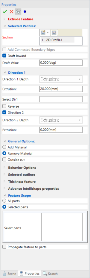 Extrusion: If Depth → Blind is selected, enter the extrusion distance.
