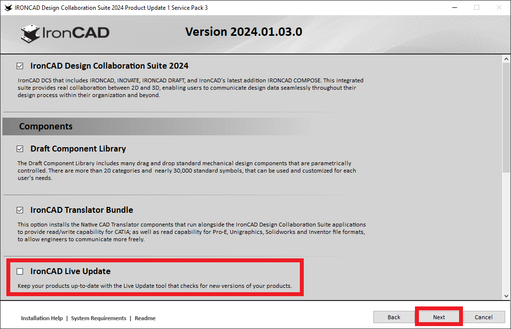 [4] Uncheck [IronCAD Live Update] From the below, then click