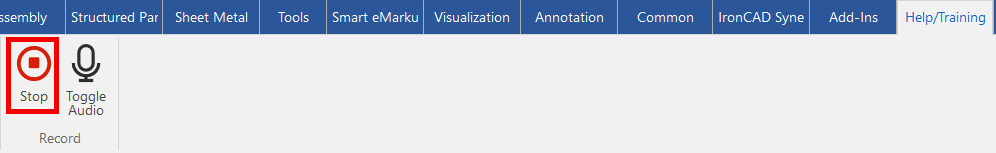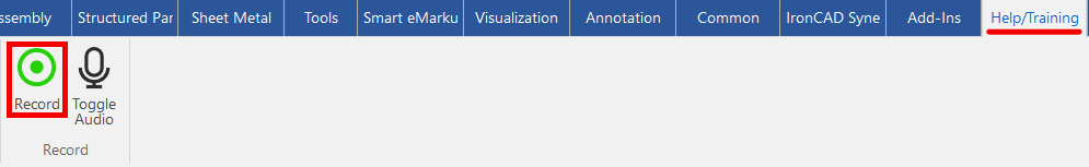 In IRONCAD, you can record your screen operations using the [Help/Training] tab → [Recording] group → [Record].