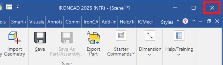 Since IRONCAD 2025, when you exit IRONCAD with Close in the upper right corner of the screen, the ability to save/close files at once has been added.