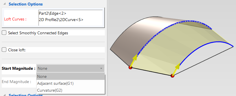When adding a loft to the edges of an existing surface or solid, you can set the continuity using Start Magnitude and End Magnitude.