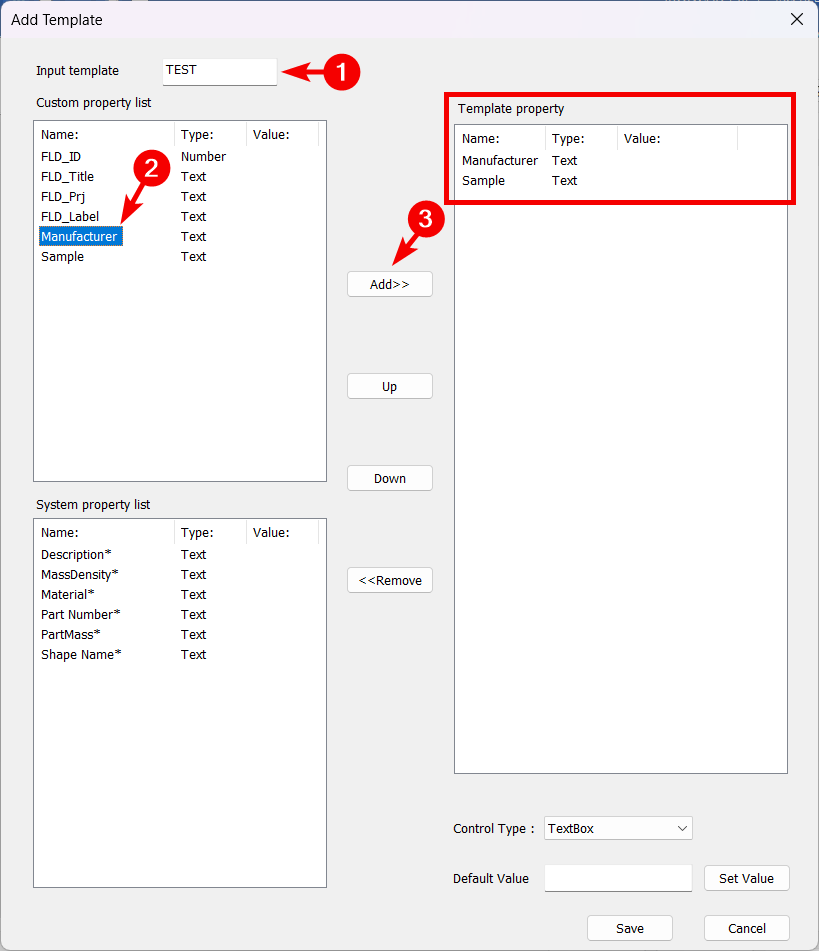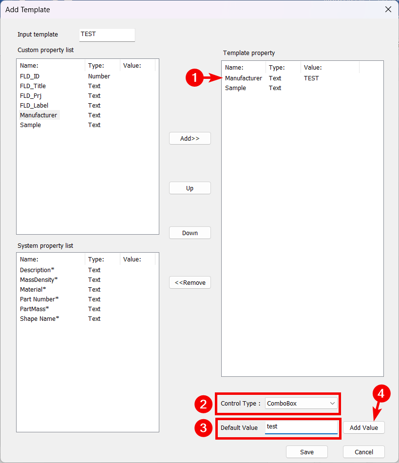 In the Template Properties list, select the item, specify the Type and Default Value, then click [Set Value].