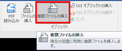 〔1〕[挿入]タブ → [オブジェクト]グループ → [複数ファイルの挿入] をクリックします。