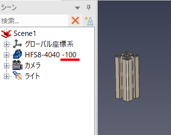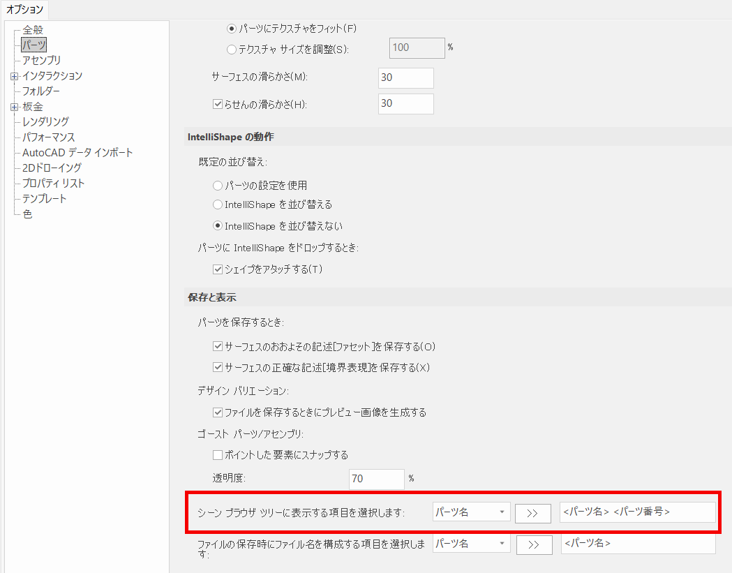 なお、[メニュー]タブ → [オプション] → [パーツ] → [シーンブラウザツリーで表示する項目を選択します] で、シーンブラウザに表示させることで、シーンブラウザでサイズボックスの値を確認できます。