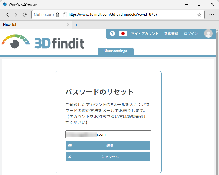下図のパスワードのリセットが表示されます。任意のアドレスを入力後、[送信] をクリックします。