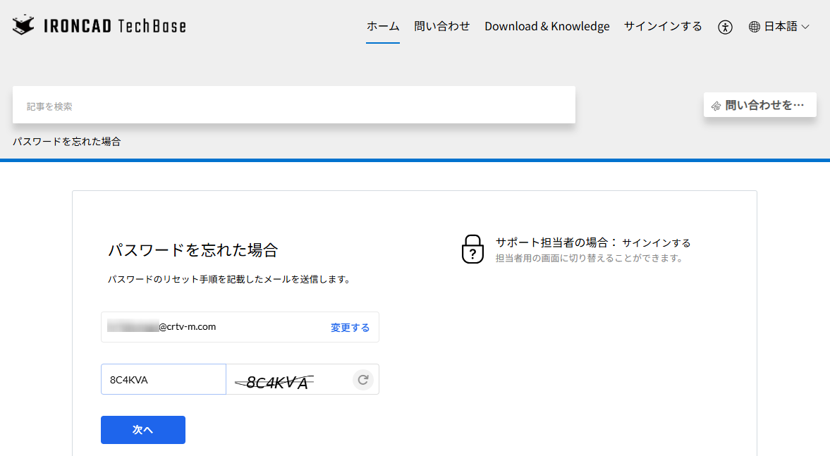 IRONCAD TechBase のサインイン画面にアクセスし、ログインページの [パスワードを忘れた場合:リセットする] をクリックしてください。